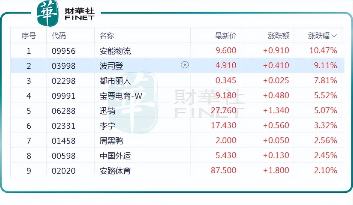 10月21日,港股“双十一”概念板块呈现全线走高态势。 其中,服饰方向涨幅领跑,波司登(03998.HK)大涨9.11%,都市丽人(02298.HK)紧随其后,上涨7.81%,迅销(06288.HK)涨5.07%,李宁(02331.HK)涨3.32%,安踏体育(02020.HK)涨2.1%;电商代运营企业宝尊电商-W(09991.HK)涨5.52%,电商平台阿里巴巴-W(09988.HK)涨1.98%。 此外,相关物流概念股也表现活跃,安能物流(09956.HK)大涨10.47%,京东物流(02618.HK)涨1.87%,中通快递-W(02057.HK)涨1.15%。