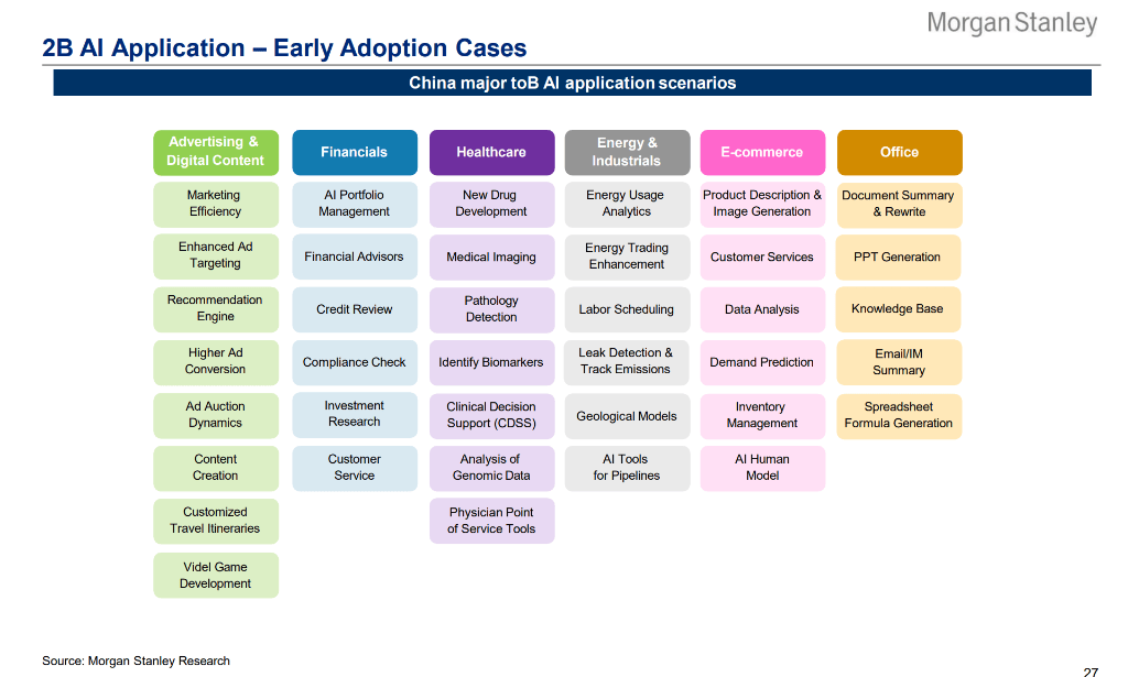 与此同时,字节跳动的豆包、百度的文心一言以及阿里的Quark和元宝等AI原生应用也在快速争夺用户时间。数据显示,这些应用正在从单纯的聊天机器人向情感交互、内容创作、甚至全能AI助手进化。对于投资者而言,这意味着拥有高用户留存和丰富场景数据的公司,将最先享受到AI带来的流量红利。 企业端(2B)的渗透与行业重塑 除了消费者端的热闹,企业端(2B)的AI渗透正在悄然改变行业格局。 大摩的2025年下半年中国CIO调查显示,企业对GenAI(生成式AI)的部署意愿强烈,且从早期的试验转向了实质性的生产力提升。在广告、医疗、金融、能源等垂直领域,AI的应用场景正在快速落地。例如,在广告领域,AI正在重塑投放效率和内容生成;在医疗领域,AI影像分析和新药研发成为关键抓手。 调查还指出,未来三年内,相当比例的工作时长将被GenAI替代,这预示着企业IT支出的重心将向AI相关基础设施倾斜。在SaaS领域,像北森这样的公司正在通过AI面试官和员工助手等功能,重塑人力资本管理市场;金山办公则通过WPS AI不仅提升了用户付费率,也巩固了其在办公软件市场的地位。