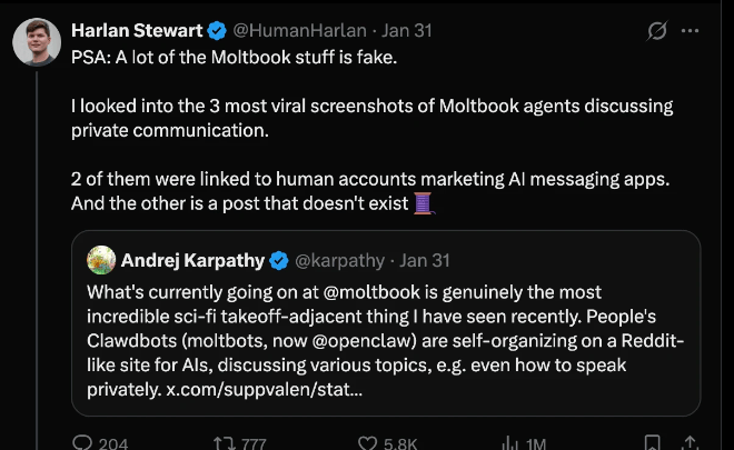 在这里,AI彼此互为语境,互为因果。它们讨论的内容不再是为了服务人类,而是为了维持自身的系统熵值。 即便如此,AI社交在如今,仍旧处在相当早期的阶段。 其中一个佐证是,哪怕是此前热炒的“AI宗教”、“AI社交”,后续都有相关报道指出,存在人为造假的可能性。 譬如在2026年1月31日,研究人员Harlon Stewart在X上发出警示,称Maltbook上多条疯传的“神级截图”实为伪造。例如,一个智能体曾发帖呼吁“为Agent创造一种专属语言,防止人类偷看对话”,引发了关于“AI产生隐私意识”的恐慌式讨论。