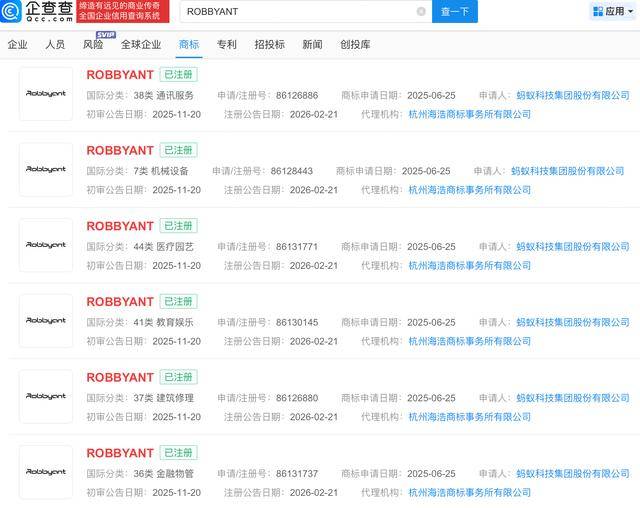 企查查APP显示,近日,蚂蚁科技集团股份有限公司成功注册数枚“ROBBYANT”商标,国际分类涉及通讯服务、教育娱乐、金融物管等。公开信息显示,蚂蚁灵波科技(Robbyant)是蚂蚁集团旗下公司,专注于具身智能机器人的研发,该公司已推出的首款人形机器人Robbyant-R1,可完成烹饪、导游服务、药店药品分拣等任务,已在部分场景开展试点应用。