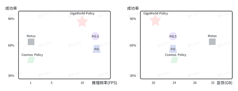 △GigaWorld-Policy,图片:文章截图 这是一套让机器人“大脑”更聪明、反应更快的核心技术。 传统方法中,机器人需要先预测未来画面再决定如何行动,过程缓慢且计算负担重。GigaWorld-Policy改变了这一逻辑:它在训练阶段学习“动作会导致什么画面”,但在实际工作时直接输出动作,跳过画面预测环节,从而让机器人的思考速度提升了10倍,同时任务成功率提高了约30%。 更重要的是,这套方案大幅降低了对真实数据的需求。它先通过海量互联网视频学习物理世界的基本规律,再结合少量机器人操作数据快速适配具体任务,整体训练效率提升了10倍。 这意味着机器人能以更低的成本、更快的速度学会新技能,为大规模商业化落地扫清了关键障碍。 目前,在抓取、装配、整理等典型任务测试中,GigaWorld-Policy的平均成功率已达85%,远超主流模型,且能同时保证高成功率和实时响应。它让世界模型从实验室走向真实场景成为可能,为机器人进入工厂、仓库、家庭提供了实际可用的“大脑”。