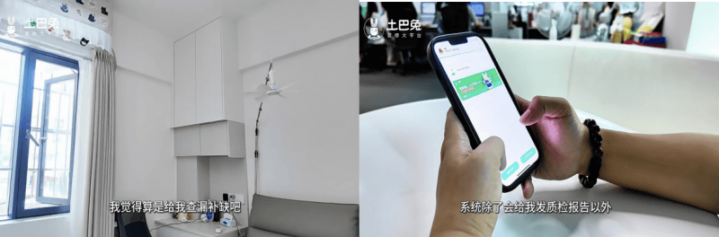 2. 流程的“透明化”:问题发现与解决机制 平台不仅发现问题,更通过系统化的流程确保问题被解决,形成了管理闭环。 案例印证(深圳00后小琳): 小琳是土巴兔的“二代用户”,她的父母在十年前就通过该平台装修。在她自己的装修过程中,质检员发现了“卫生间墙砖空鼓”这一隐蔽问题,并通过“拍照记录、上传反馈、问题解决”一整套标准化操作迅速处理。小琳感慨:“要是没有质检员,我根本发现不了。”这种直观、高效的体验,让她可以“放心地去推荐”。