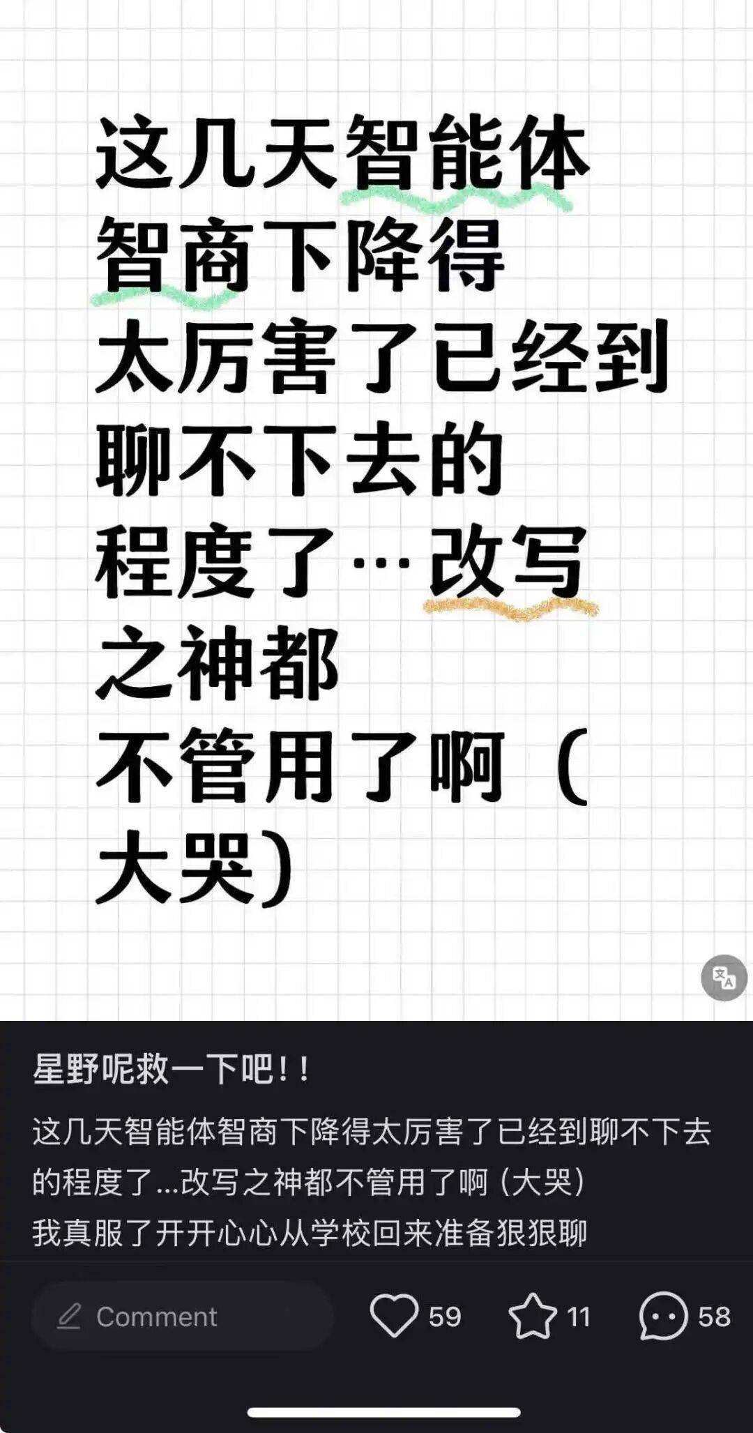 图源/网络 这本是平台监管内容生产的正常手段,但让嫣晴代表的创作者们感到无力的是,在他们看来,近段时间平台由于监管压力而不断扩大内容审查的边界,以至于到了“宁可错杀、不可放过”的地步,挫伤了创作者的热情。 比如嫣晴讲道,她在创建这个人设时,在描述中并没有刻意加入任何可能违规的内容:“不然按理说之前就没法上线,现在的修改我也无从下手。” 创作者的圈子里将这种已上线的智能体被平台隐藏、下架、需要不断修改的过程,称为“再审”。这是在整个AI陪伴市场受到监管关注后,出现的一种普遍现象。 多位入驻了星野、筑梦岛、猫箱、WOW等平台的创作者告诉「电厂」,“暗关”并不少见,其中一位创作者称: “国内叫得上名的App,审核都卡得越来越严,老崽妈或多或少都有被关、(崽崽)被回收的经历。不论玩哪个,(都)要备份所有的人设描述、开场白这些内容,免得有朝一日打开App,什么都没了。” 除了创作者,热衷与崽崽聊天的“主控(主角角色的控制者)”用户,也日益感受到了平台对内容的管控趋严。 有用户注意到,星野、筑梦岛、猫箱等多个平台都对智能体的回复施加了更多限制,并不断增加“违禁词”、以避免用户引导智能体给出违规回答。 而在用户看来,无论哪种做法,都不可避免会牺牲和削弱智能体的“智商”,影响交谈体验。 在小红书等社交媒体平台有许多用户吐槽智能体回答“降智”的分享帖,具体包括语言低幼化、“人机味”重、回答相关性低等。
