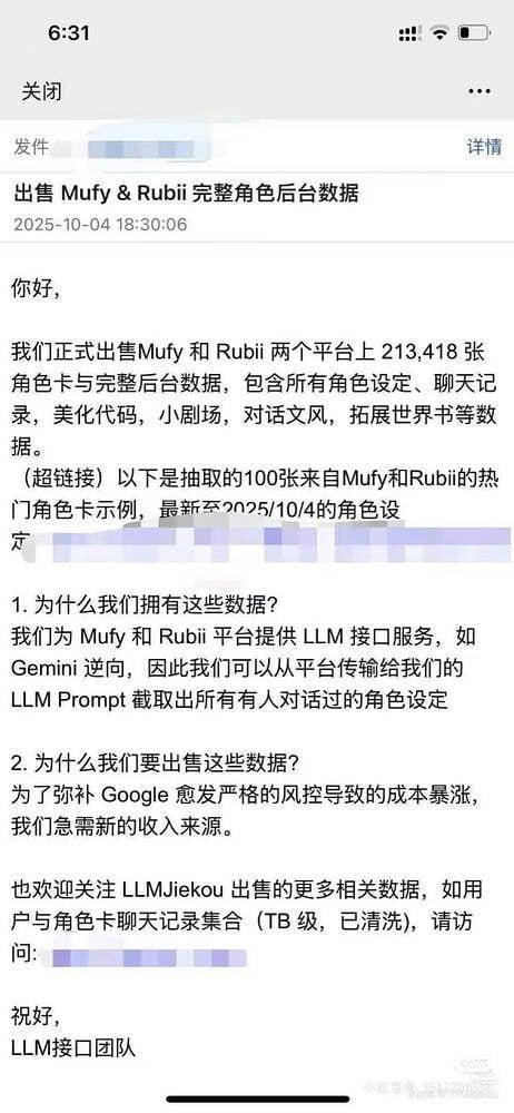 信息出售邮件部分内容 图/网络 考虑到一张角色卡可以链接到不同用户,事件涉及的用户数量至少达到数十万级别。 随后myfy官方发布声明称,已修复相关信息漏洞并计划提供用户补偿,但仍引起了许多用户的大面积担忧。 同样在10月,“青丘语”平台网页、App多次出现网络异常等问题。官方回应称,这是因为浙江、福建等部分地区运营商对其进行了屏蔽。至今,官方称仍在尝试解决这一问题,但未回应预计修复时间。 此外,不少平台还曝出了创作者抄袭人设等内容管理问题。 对小型团队运营的部分新兴AI陪伴应用而言,其抗风险能力、技术及工程化实力、售后等软服务能力,都要打上一个问号。