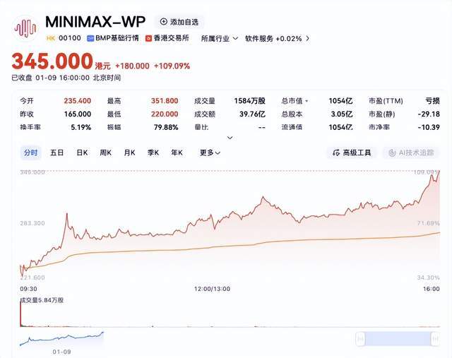 AI生成的内容正无缝嵌入日常——清晨的新闻摘要、工作时的文档助手、傍晚的短视频灵感,都可能由AI悄然驱动。而创立于2022年初的MiniMax,正是这股浪潮中冲在最前方的弄潮儿。它以“四年从创立到上市”的惊人速度,创下了全球人工智能领域公司的最快IPO纪录。 2026年1月9日,这家国产大模型领域的明星公司——上海稀宇科技(MiniMax)正式在港交所挂牌上市。其以165港元/股的发行价,成功募集资金超48亿港元。上市首日股价大幅高开,盘中一度飙升超过80%。截至今日收盘,股价报收345港元/股,较发行价暴涨109.09%,公司总市值随之跃升至1054亿港元。