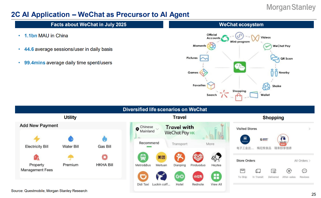 摩根士丹利认为,市场正在发生结构性转变:尽管全球AI竞赛喧嚣尘上,但中国正在走出一条独特的路径——即“开放”模型策略对抗世界的“封闭”体系。 据追风交易台,1月8日,大摩的发布的最新研报显示,在全球前10名的SOTA(当前最佳)模型中,中国已占据半壁江山。大摩预计2027年中国云端AI的总潜在市场规模(TAM)将达到500亿美元。这表明,虽然外部环境复杂,但中国本土的算力供应链韧性正在增强,为上层应用的爆发提供了底层支撑。 对于投资者而言,关注点不应仅仅停留在基础设施的军备竞赛上,更应转向应用层的变现能力与生态壁垒。 报告明确指出,中国在数据量、电力供应以及工程师红利上拥有显著的比较优势。在具体的标的选择上,大摩认为阿里巴巴凭借其云计算和模型能力的结合,成为中国AI发展的“最佳赋能者”;而腾讯则依托微信生态,拥有最高的消费者端(2C)变现潜力和高投资回报率(ROI)。这一判断意味着资本市场的定价逻辑将从单纯的算力炒作,转向那些拥有庞大用户基数、私有数据积累以及能够实质性落地AI应用的平台型巨头。 超级应用与AI原生应用的双轨并行 在应用层面,中国市场呈现出“超级应用”进化与“AI原生应用”爆发并行的独特景观。 大摩特别强调了微信作为AI Agent(智能体)先驱的巨大潜力。截至2025年7月,微信拥有11亿月活跃用户(MAU),日均用户时长高达99.4分钟,且日均人均会话次数达到44.6次。这种高频、深度的用户粘性为AI Agent的植入提供了完美的土壤,使其能够无缝接入生活、购物、旅行等多元场景。