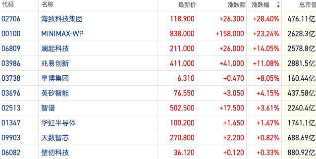 导读:受国内AI“春节档”上新潮带动,港股蛇年最后一个交易日AI概念表现亮眼,大模型、存储、算力等多个赛道行情火热。 截至发稿,Minimax-WP(00100.HK)涨超23%,澜起科技(06809.HK)涨约14%,兆