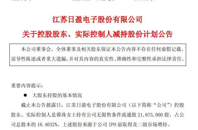 2月27日,日盈电子(SH603286,股价66.36元,市值77.90亿元)控股股东、实际控制人是蓉珠因“个人资金需求”,抛出了最高减持公司3%股份的计划。
